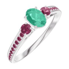 Anillo Oro blanco 9 quilates - Esmeralda Ovalo 0.3 quilates - Piedras laterales Rubí - Engastado Rubí
