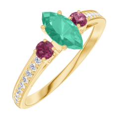 Anillo Oro amarillo 9 quilates - Esmeralda Marquesa 0.3 quilates - Piedras laterales Rubí - Engastado Diamante