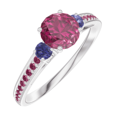 Anillo Oro blanco 18 quilates - Rubí redondo 0.5 quilates - Piedras laterales Zafiro azul - Engastado Rubí
