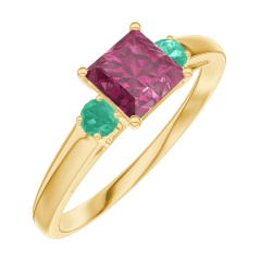 Anillo Oro amarillo 9 quilates - Rubí Princesa 0.5 quilates - Piedras laterales Esmeralda