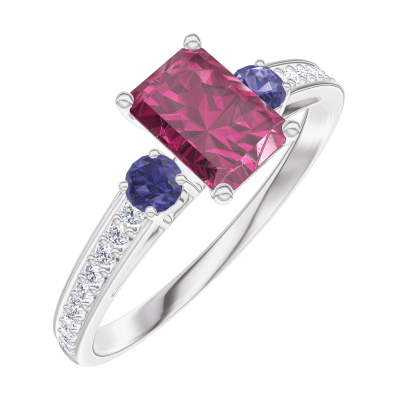 « L'ATELIER » Nº163268Anillo Oro blanco 9 quilates - Rubí Rectángulo 0.5 quilates - Piedras laterales Zafiro azul - Engastado Diamante