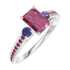 Anillo Oro blanco 18 quilates - Rubí Rectángulo 0.5 quilates - Piedras laterales Zafiro azul - Engastado Rubí