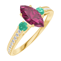 Anillo Oro amarillo 9 quilates - Rubí Marquesa 0.5 quilates - Piedras laterales Esmeralda - Engastado Diamante