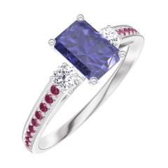 Anillo Oro blanco 9 quilates - Zafiro azul Rectángulo 0.5 quilates - Piedras laterales Diamante - Engastado Rubí