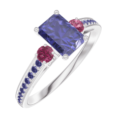 Anillo Oro blanco 9 quilates - Zafiro azul Rectángulo 0.5 quilates - Piedras laterales Rubí - Engastado Zafiro azul