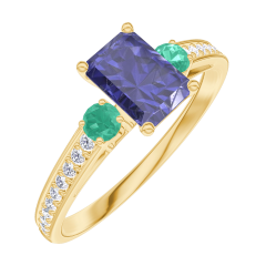Anillo Oro amarillo 9 quilates - Zafiro azul Rectángulo 0.5 quilates - Piedras laterales Esmeralda - Engastado Diamante