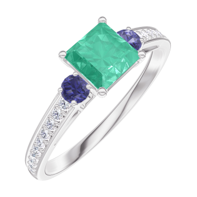 « L'ATELIER » Nº164367Anillo Oro blanco 18 quilates - Esmeralda Princesa 0.5 quilates - Piedras laterales Zafiro azul - Engastado Diamante