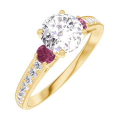 Anillo Oro amarillo 9 quilates - Diamante redondo 0.7 quilates - Piedras laterales Rubí - Engastado Diamante