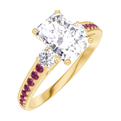 Anillo Oro amarillo 9 quilates - Diamante Rectángulo 0.7 quilates - Piedras laterales Diamante - Engastado Rubí