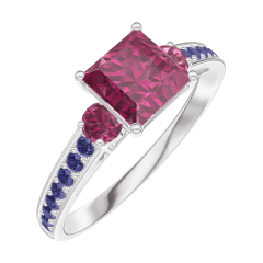 Anillo Oro blanco 9 quilates - Rubí Princesa 0.7 quilates - Piedras laterales Rubí - Engastado Zafiro azul