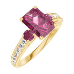 Anillo Oro amarillo 9 quilates - Rubí Rectángulo 0.7 quilates - Piedras laterales Rubí - Engastado Diamante