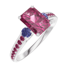 Anillo Oro blanco 9 quilates - Rubí Rectángulo 0.7 quilates - Piedras laterales Zafiro azul - Engastado Rubí