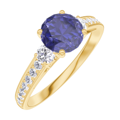 Anillo Oro amarillo 9 quilates - Zafiro azul redondo 0.7 quilates - Piedras laterales Diamante - Engastado Diamante