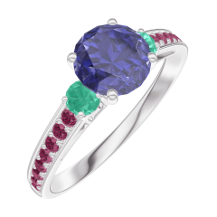 Anillo Oro blanco 18 quilates - Zafiro azul redondo 0.7 quilates - Piedras laterales Esmeralda - Engastado Rubí