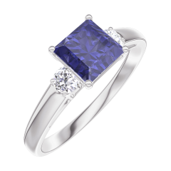 Anillo Oro blanco 18 quilates - Zafiro azul Princesa 0.7 quilates - Piedras laterales Diamante