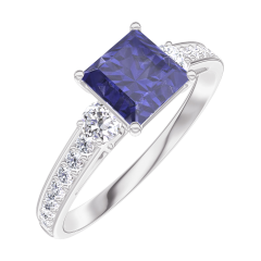 Anillo Oro blanco 9 quilates - Zafiro azul Princesa 0.7 quilates - Piedras laterales Diamante - Engastado Diamante