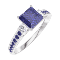 Anillo Oro blanco 18 quilates - Zafiro azul Princesa 0.7 quilates - Piedras laterales Diamante - Engastado Zafiro azul