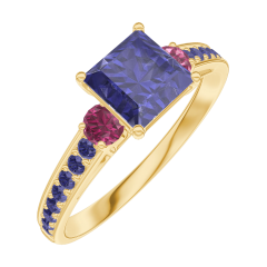 Anillo Oro amarillo 9 quilates - Zafiro azul Princesa 0.7 quilates - Piedras laterales Rubí - Engastado Zafiro azul
