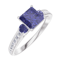 Anillo Oro blanco 9 quilates - Zafiro azul Princesa 0.7 quilates - Piedras laterales Zafiro azul - Engastado Diamante