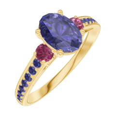 Anillo Oro amarillo 18 quilates - Zafiro azul Ovalo 0.7 quilates - Piedras laterales Rubí - Engastado Zafiro azul