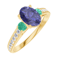 Anillo Oro amarillo 18 quilates - Zafiro azul Ovalo 0.7 quilates - Piedras laterales Esmeralda - Engastado Diamante
