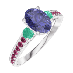 Anillo Oro blanco 18 quilates - Zafiro azul Ovalo 0.7 quilates - Piedras laterales Esmeralda - Engastado Rubí