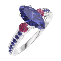 Anillo Oro blanco 18 quilates - Zafiro azul Marquesa 0.7 quilates - Piedras laterales Rubí - Engastado Zafiro azul