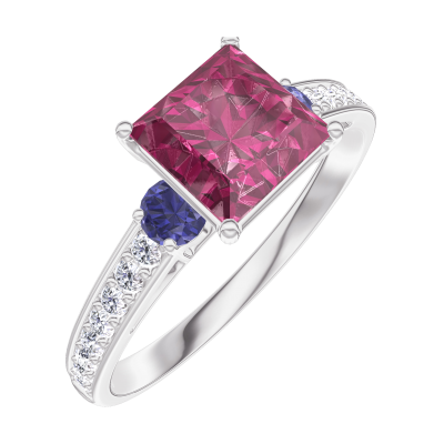 « L'ATELIER » Nº167968Anillo Oro blanco 9 quilates - Rubí Princesa 1 quilates - Piedras laterales Zafiro azul - Engastado Diamante