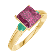 Anillo Oro amarillo 9 quilates - Rubí Princesa 1 quilates - Piedras laterales Esmeralda