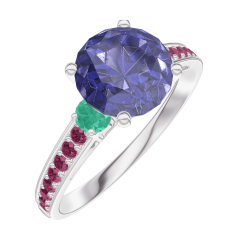 Anillo Oro blanco 18 quilates - Zafiro azul redondo 1 quilates - Piedras laterales Esmeralda - Engastado Rubí