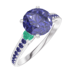 Anillo Oro blanco 18 quilates - Zafiro azul redondo 1 quilates - Piedras laterales Esmeralda - Engastado Zafiro azul