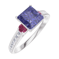 Anillo Oro blanco 9 quilates - Zafiro azul Princesa 1 quilates - Piedras laterales Rubí - Engastado Diamante