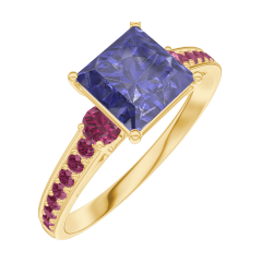 Anillo Oro amarillo 18 quilates - Zafiro azul Princesa 1 quilates - Piedras laterales Rubí - Engastado Rubí