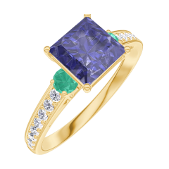 Anillo Oro amarillo 9 quilates - Zafiro azul Princesa 1 quilates - Piedras laterales Esmeralda - Engastado Diamante