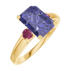 Anillo Oro amarillo 9 quilates - Zafiro azul Rectángulo 1 quilates - Piedras laterales Rubí