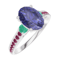 Anillo Oro blanco 9 quilates - Zafiro azul Ovalo 1 quilates - Piedras laterales Esmeralda - Engastado Rubí