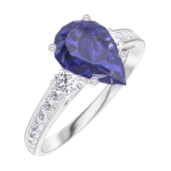 Anillo Oro blanco 9 quilates - Zafiro azul Pera 1 quilates - Piedras laterales Diamante - Engastado Diamante