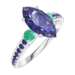 Anillo Oro blanco 9 quilates - Zafiro azul Marquesa 1 quilates - Piedras laterales Esmeralda - Engastado Zafiro azul