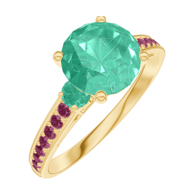 « L'ATELIER » Nº169090Anillo Oro amarillo 9 quilates - Esmeralda redondo 1 quilates - Piedras laterales Esmeralda - Engastado Rubí 4.9