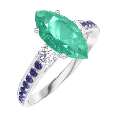 Anillo Oro blanco 9 quilates - Esmeralda Marquesa 1 quilates - Piedras laterales Diamante - Engastado Zafiro azul