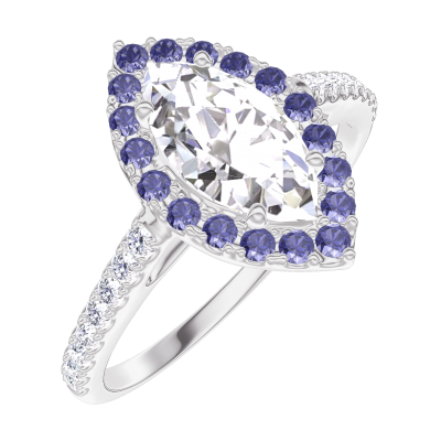 « L'ATELIER » N.º 170280Anillo Oro blanco 9 quilates - Diamante Marquesa 0.5 quilates - Halo Zafiro azul - Engastado Diamante