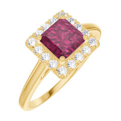 Anillo Oro amarillo 9 quilates - Rubí Princesa 0.5 quilates - Halo Diamante