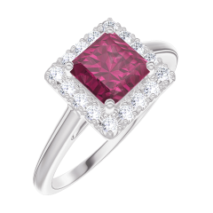 Anillo Oro blanco 18 quilates - Rubí Princesa 0.5 quilates - Halo Diamante