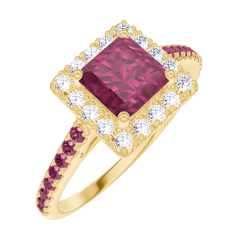 Anillo Oro amarillo 18 quilates - Rubí Princesa 0.5 quilates - Halo Diamante - Engastado Rubí
