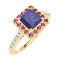 Anillo Oro amarillo 18 quilates - Zafiro azul Princesa 0.5 quilates - Halo Rubí - Engastado Diamante