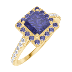 Anillo Oro amarillo 9 quilates - Zafiro azul Princesa 0.5 quilates - Halo Zafiro azul - Engastado Diamante