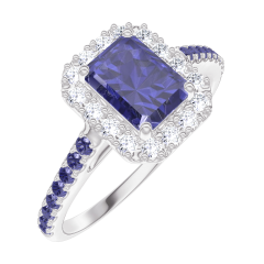 Anillo Oro blanco 9 quilates - Zafiro azul Rectángulo 0.5 quilates - Halo Diamante - Engastado Zafiro azul