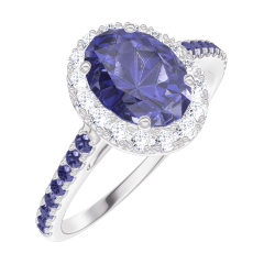 Anillo Oro blanco 9 quilates - Zafiro azul Ovalo 0.5 quilates - Halo Diamante - Engastado Zafiro azul