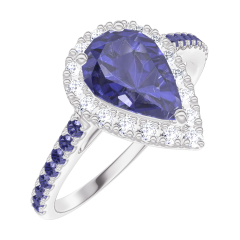 Anillo Oro blanco 9 quilates - Zafiro azul Pera 0.5 quilates - Halo Diamante - Engastado Zafiro azul