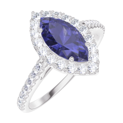 Anillo Oro blanco 18 quilates - Zafiro azul Marquesa 0.5 quilates - Halo Diamante - Engastado Diamante